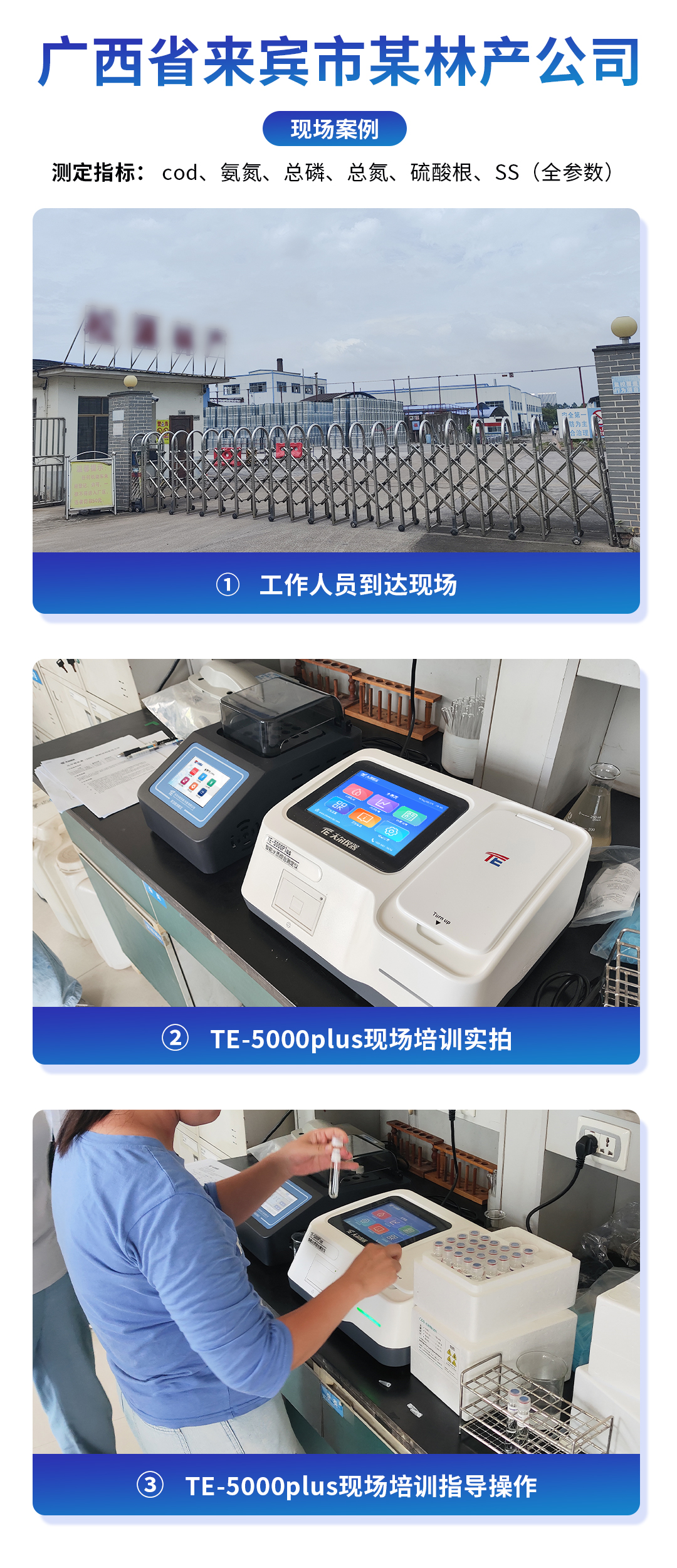 客户案例:广西省来宾市某林产公司购买仪器:天尔TE-5000Plus水质综合多参数测定仪检测项目:COD、总磷、总氮、氨氮、硫酸根等多项指标