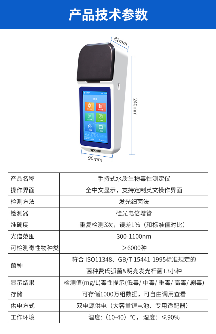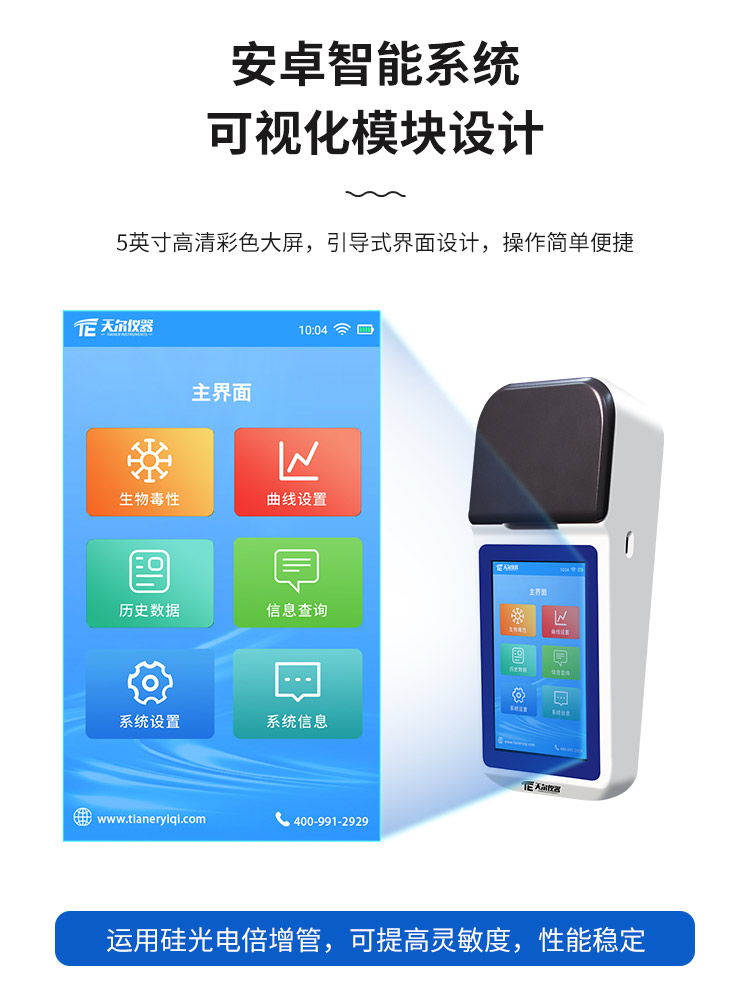 简要描述:根据发光细菌在新陈代谢时发光强度的变化进行定性和定量检测,采用安卓智能操作系统,可视化模块设计,搭载高清彩色液晶大屏,触控式界面设计,操作简单便捷