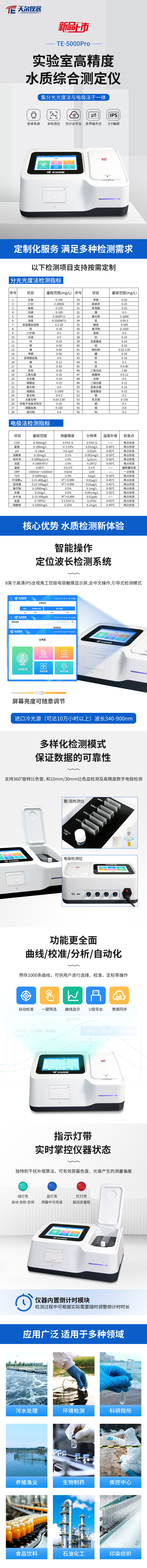检测项目:COD、氨氮、总磷、总氮、浊度、色度、重金属、pH、溶解氧、电导率、ORP、叶绿素、TDS、水中油等百种项目