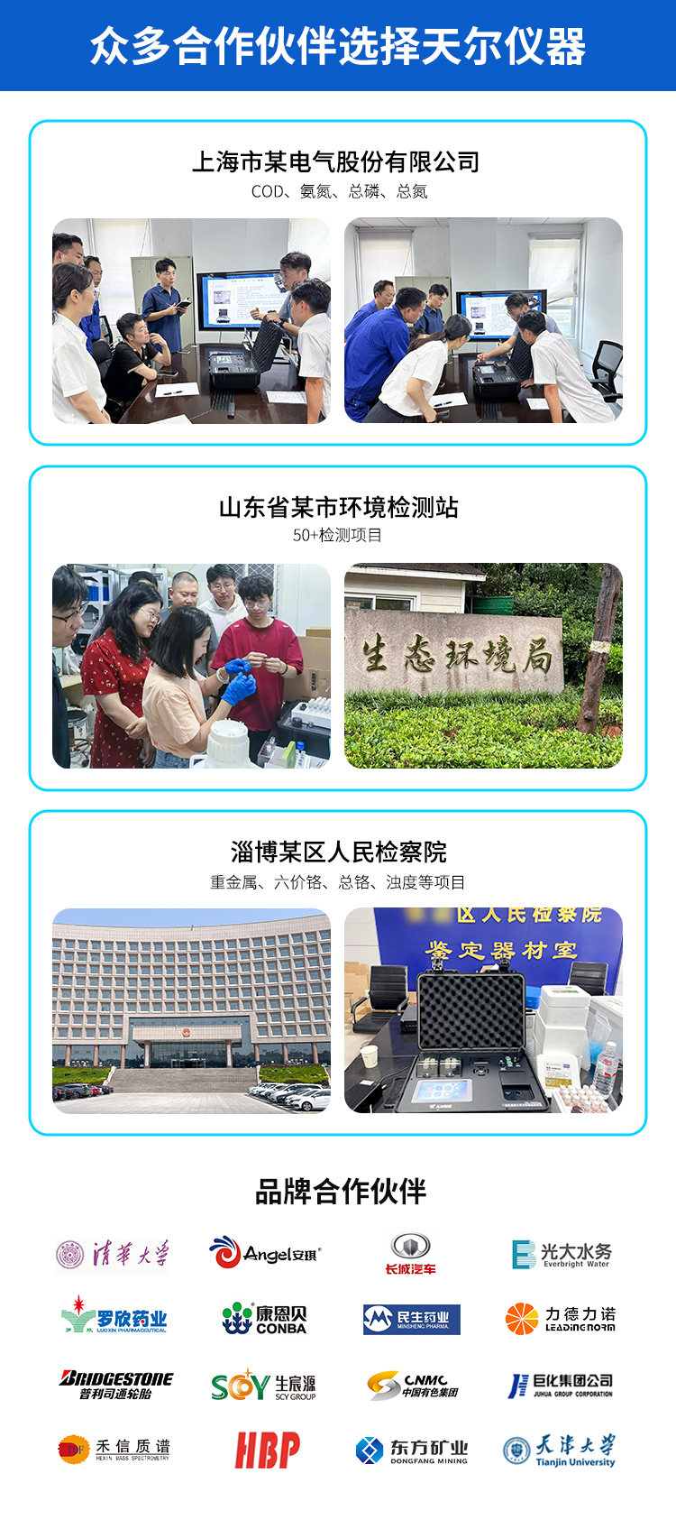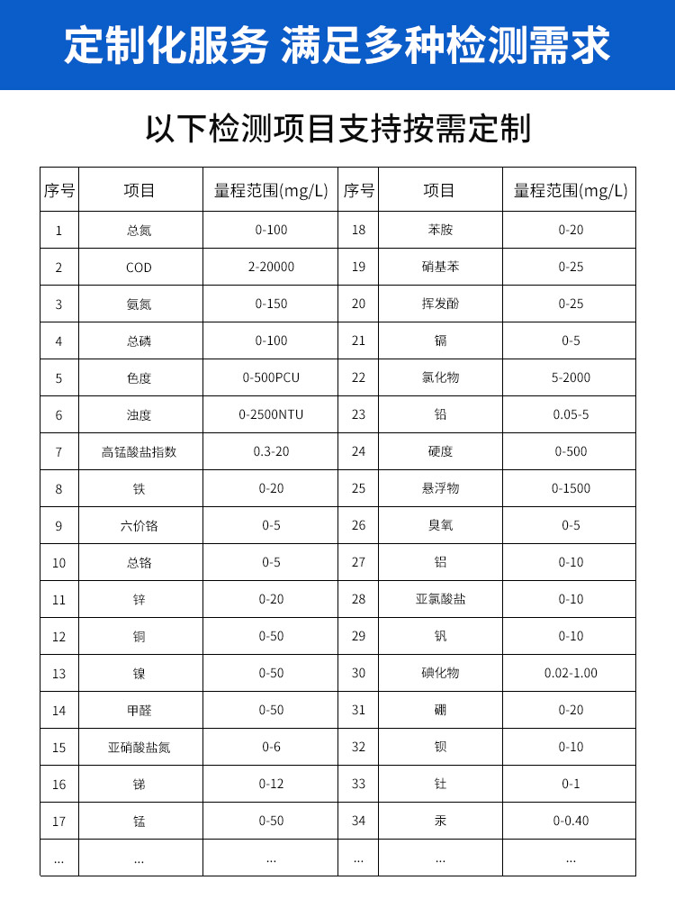 检测项目:COD 、氨氮、总磷、总氮、浊度、色度、悬浮物、重金属等50多项指标