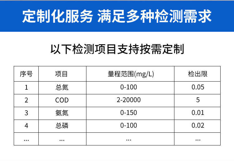 7. ꧒侧量范围之内:COD(2-20000mg/L)、高锰酸盐指数(0-150mg/L)、总磷(0-100mg/L)、总氮(0-100mg/L)、