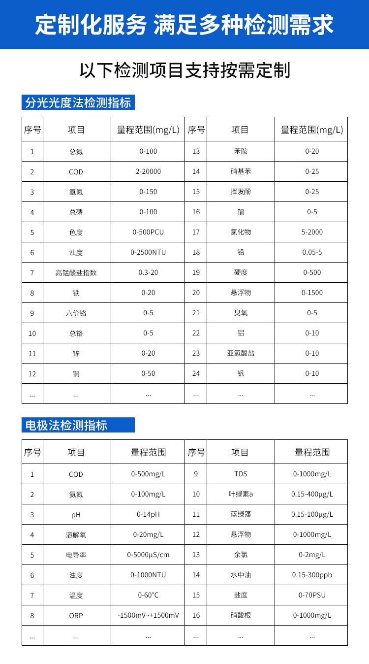 检测项目:COD 、氨氮、总磷、总氮、浊度、色度、悬浮物、重金属、pH、溶解氧、电导率等70多项指标