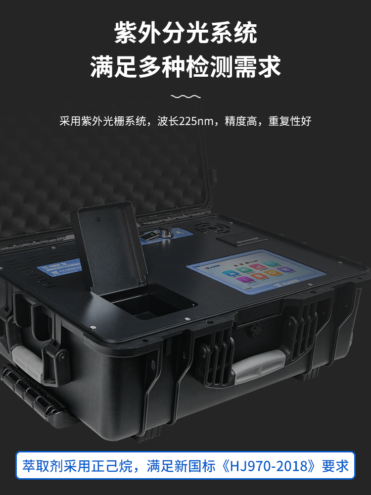 简要描述:内置大容量锂电池,高强度防水一体化设计,方便快捷,一键式检测 采用紫外光栅系统,波长225nm,用于测油分析扫描,精度高,重复性好,内置打印机,8寸触摸大屏,标配前处理设备箱,可以实现采样、萃取、测量一体化,解决现场测量,具有自动统计分析、储存、打印等功能,一体化设计,仪器小巧、方便携带,便于户外现场操作