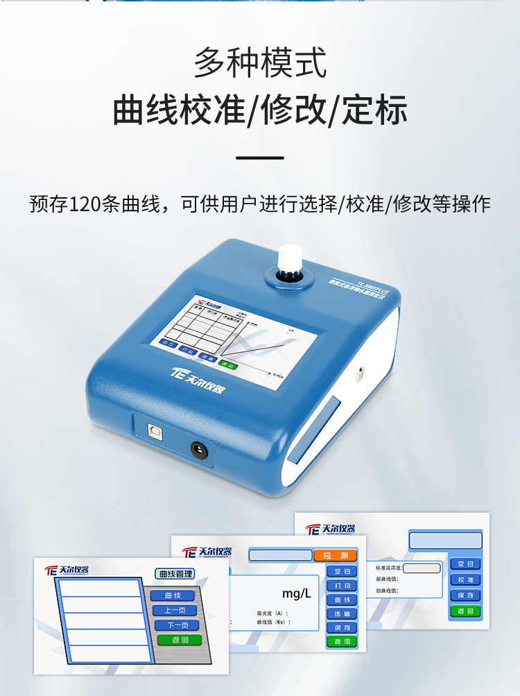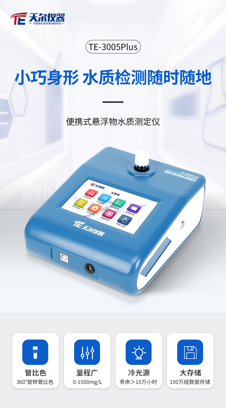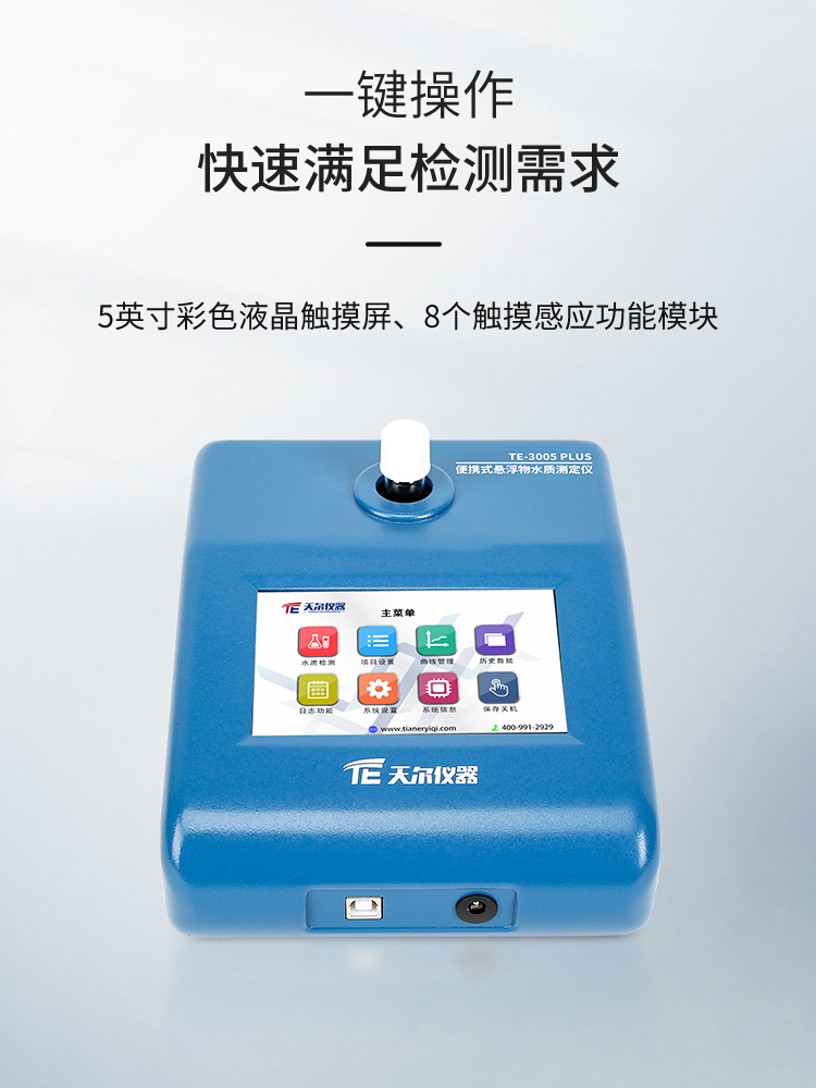 TE-3005Plus 便携式悬浮物水质测定仪通过金属检查技术应用,360°翻转检侧,5英尺色彩教学液晶触控屏、出口LED光源,内嵌常用饮用水质监测系统软件,功效稳固、自动测量最准、法测定超范围广、模块强、运作比较简单,氧浓度直读,可高速检测工具水面浮悬物水平。