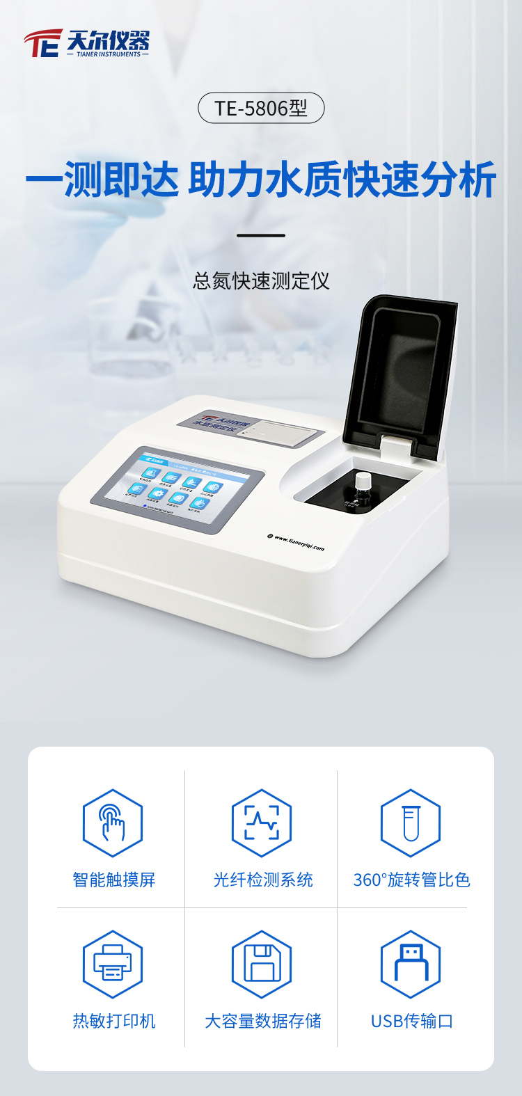 TE-5806总氮高效分析仪用于光仟的探测工具技巧,7英尺五颜六色液晶拼接屏摸屏、八个摸感應用途表系统性架构、人性本恶化实施办法设计的概念,操作的流程节省时间,360°翻转视频比色的探测工具,利用进囗的医疗仪器灯光,专业的生活饮用水的探测工具仪系统性,TE-5806总氮高效分析仪性维持、检测精确、分析空间广、用途表坚强、操作的流程简略,氧浓度直读,可迅猛测试自来水中总氮的分量。