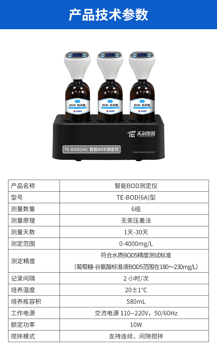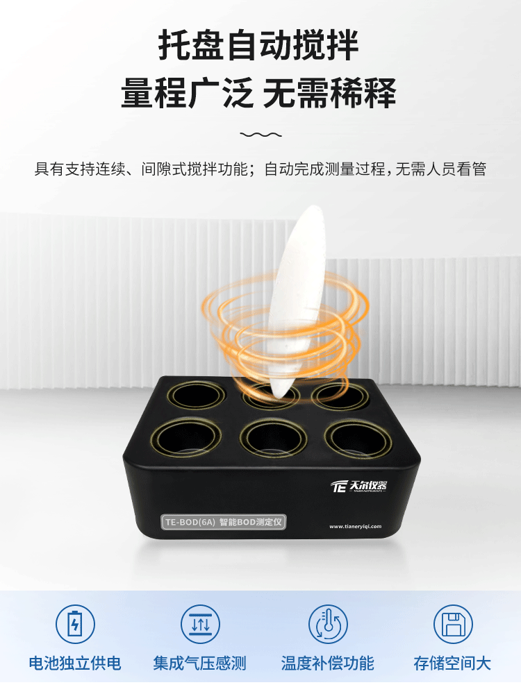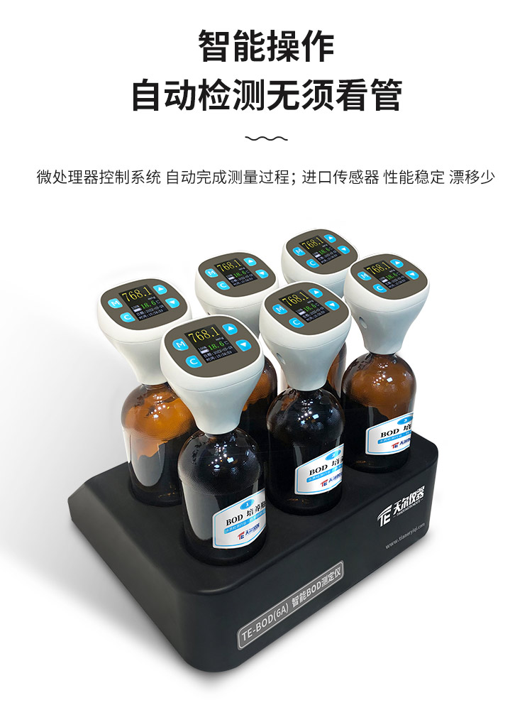 简要描述:采用无汞压差检测法,使用安全可靠.TE-BOD(6A) 型智能BOD测定仪含有6个单元独立显示测试位,每个单元测试位单独计时测试,每个测试位内置锂电池,每个测试位独立显示取样量、测定值、测试时间与所有测定信息,自动完成测量过程、无需专人看管、安全可靠、智能微电脑控制