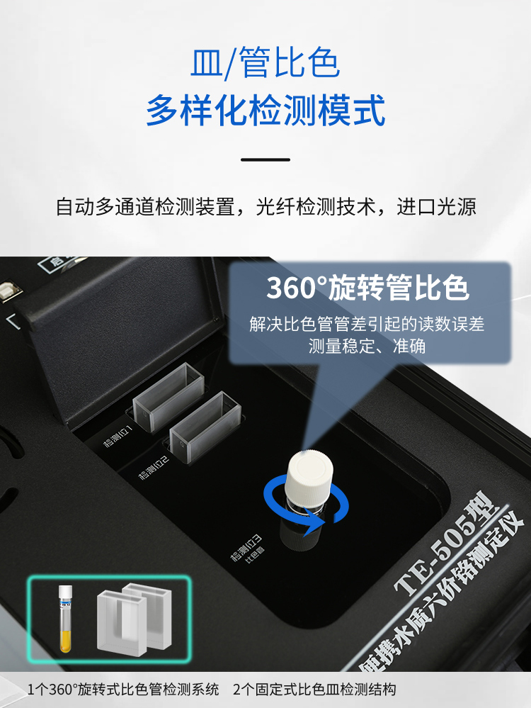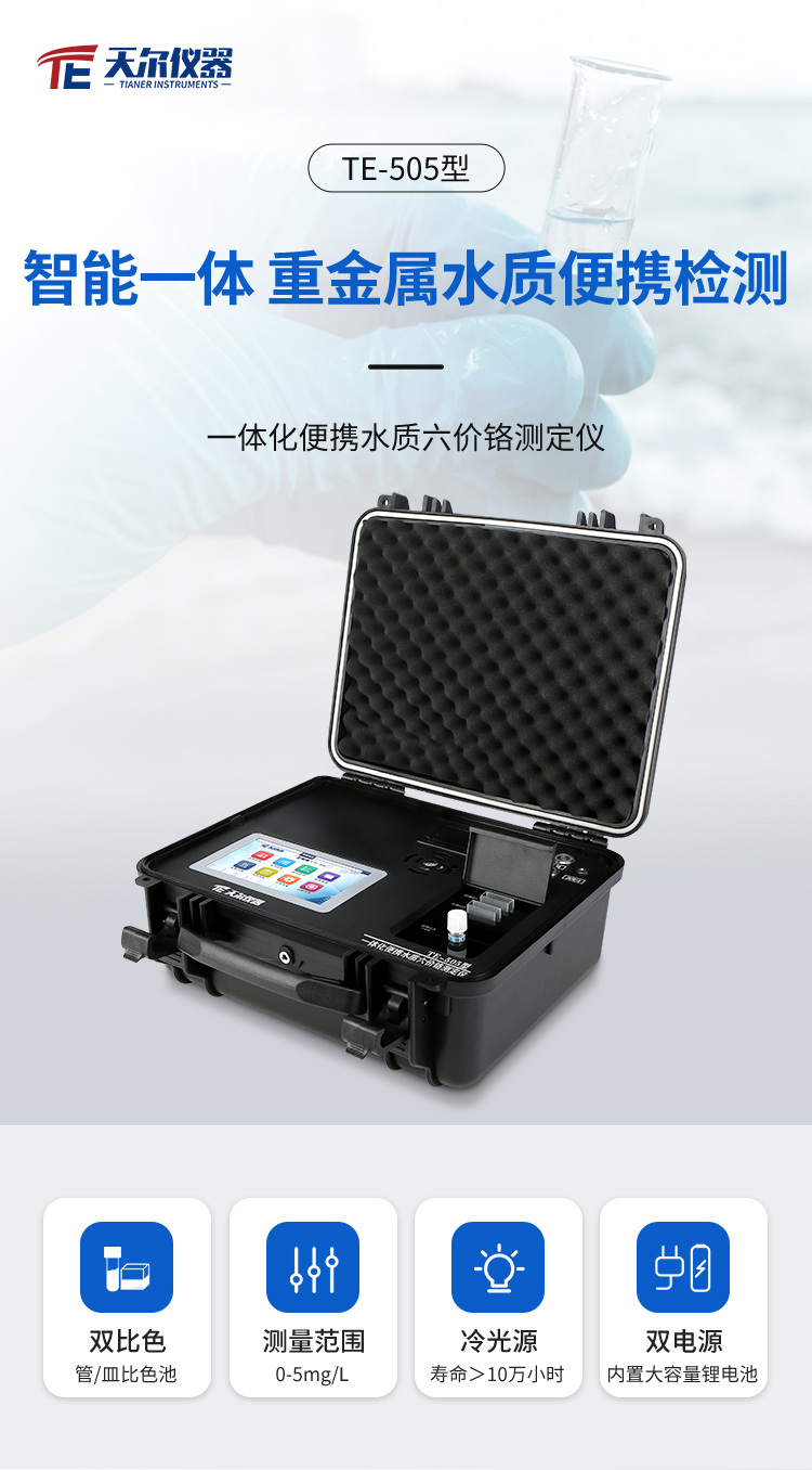 ⭕TE-505携便式水质检测六价铬检测仪选择军工级高強度防渗台式安全的箱内置式化设计,15个360°智能旋轉式比色管查重平台,6个智能比色皿查重结构特征,也可探测二个是一样的被污染物质的水样,双温区消解组件,独力温控仪,字母化集成体系体系,光钎预估设备,7屏幕尺寸采色显示屏触控屏、7个触控查测效果组件、人的本质化指引相结合方案,实操方便,运行德国医疗用具灯光,工程专业污水水质标准预估仪体系,TE-5500Plus整体化一体式污水水质标准血本属预估体系特点固定、预估确切、测定方法标准广、效果庞大、实操简略,可飞速预估水里六价铬含锌量。