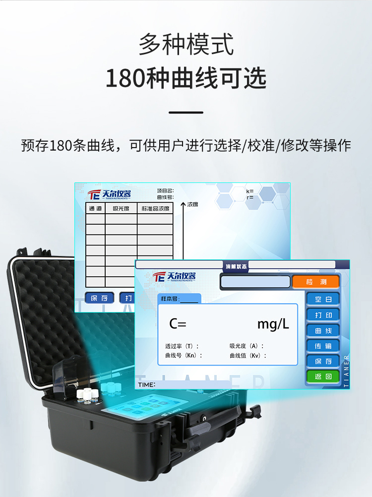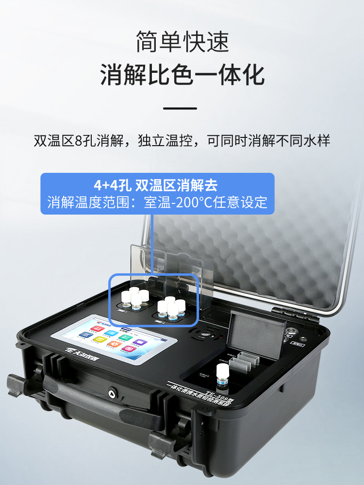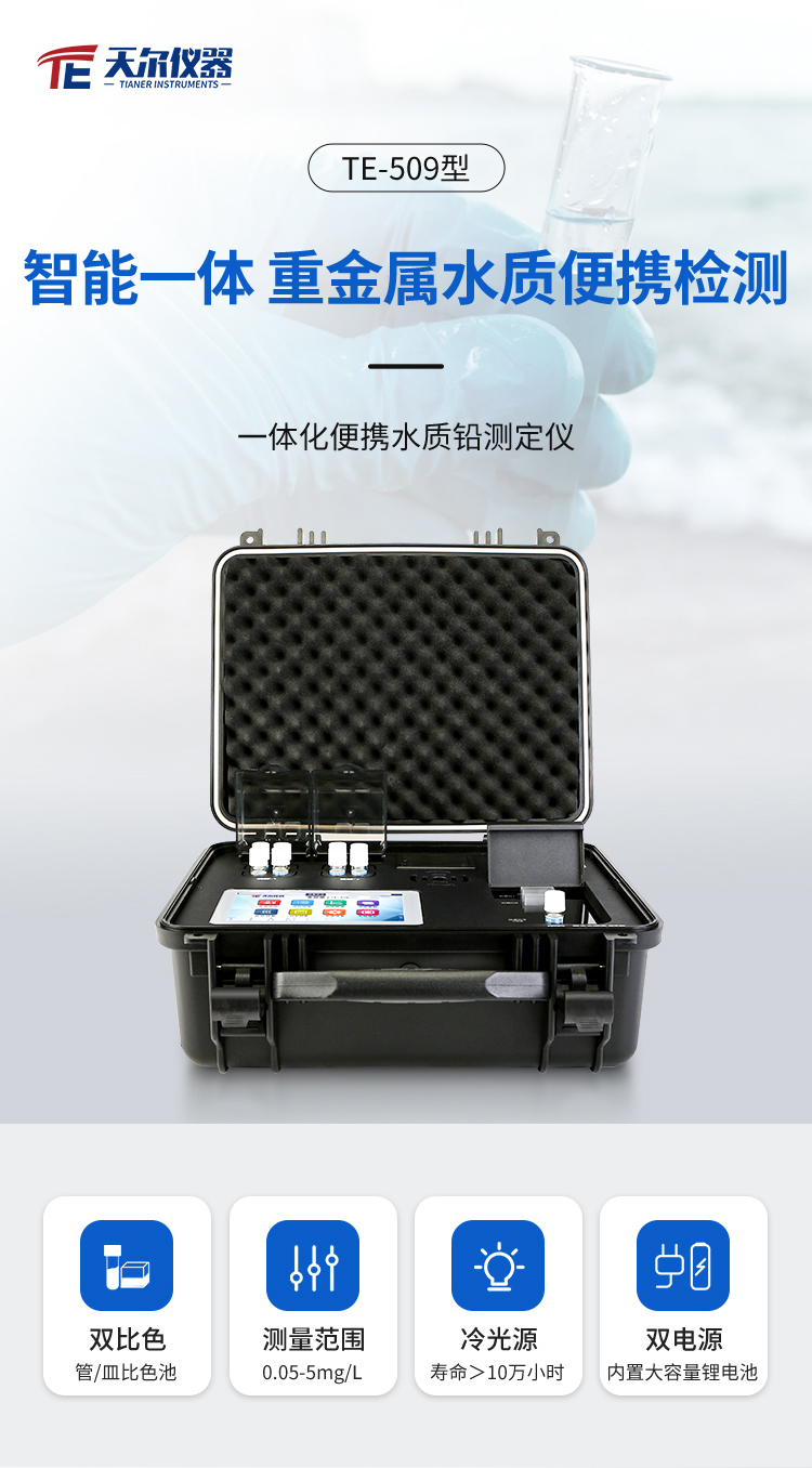TE-509携便式式水体质量铅测量仪运用军工用级高韧性度防水的手提式安会箱混合式化装修设计,♒3个360°自動翻转式比色管查重系統,多个自動比色皿查重组成,同時可检查几个一模一样污染问题物的水样,ღ双温区消解电源信息模块,单独的温度控制器,数字5化ibms装置,网络光纤测试水平,7寸大彩色的液晶显示器触控屏、3个触控感受到的功能电源信息模块、本性化指引相结合设计,运营高效快捷,通过国外进口医疗用具LED光源,专业技术环境质量测试仪装置,TE-5500Plus一体化便携水质重金属检测系统性能稳定、测量准确、测定范围广、功能强大、操作简单,可快速检测水中铅占比。